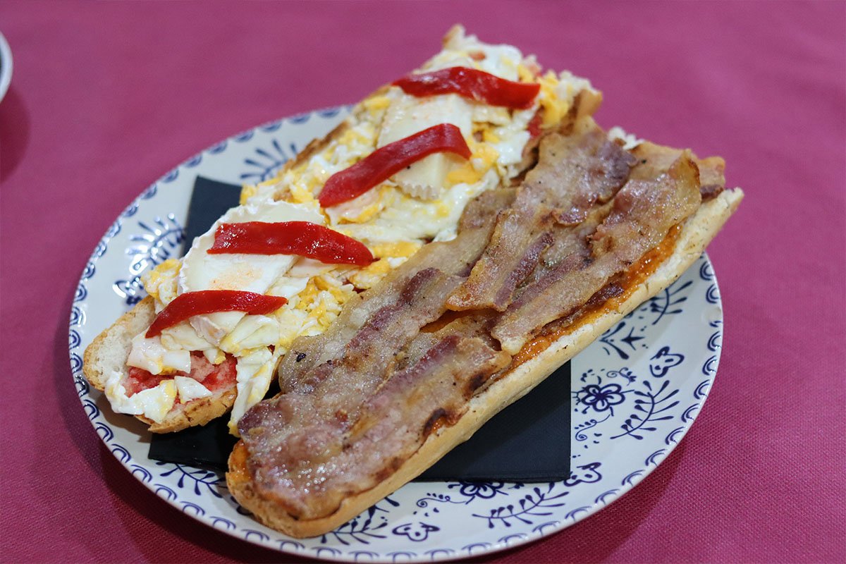 Bocadillo Mesón Casa Laura: Pan a la brasa, panceta curada, huevo revuelto, queso de cabra, pimientos del piquillo, tomate y alioli de pimentón.
