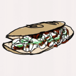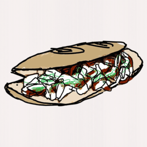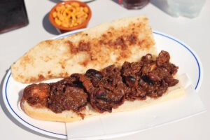 Bocadillo Mesón Casa Laura: Pan a la brasa, panceta curada, huevo revuelto, queso de cabra, pimientos del piquillo, tomate y alioli de pimentón.